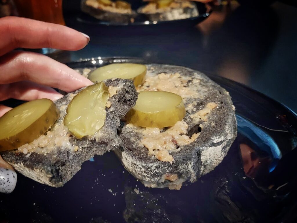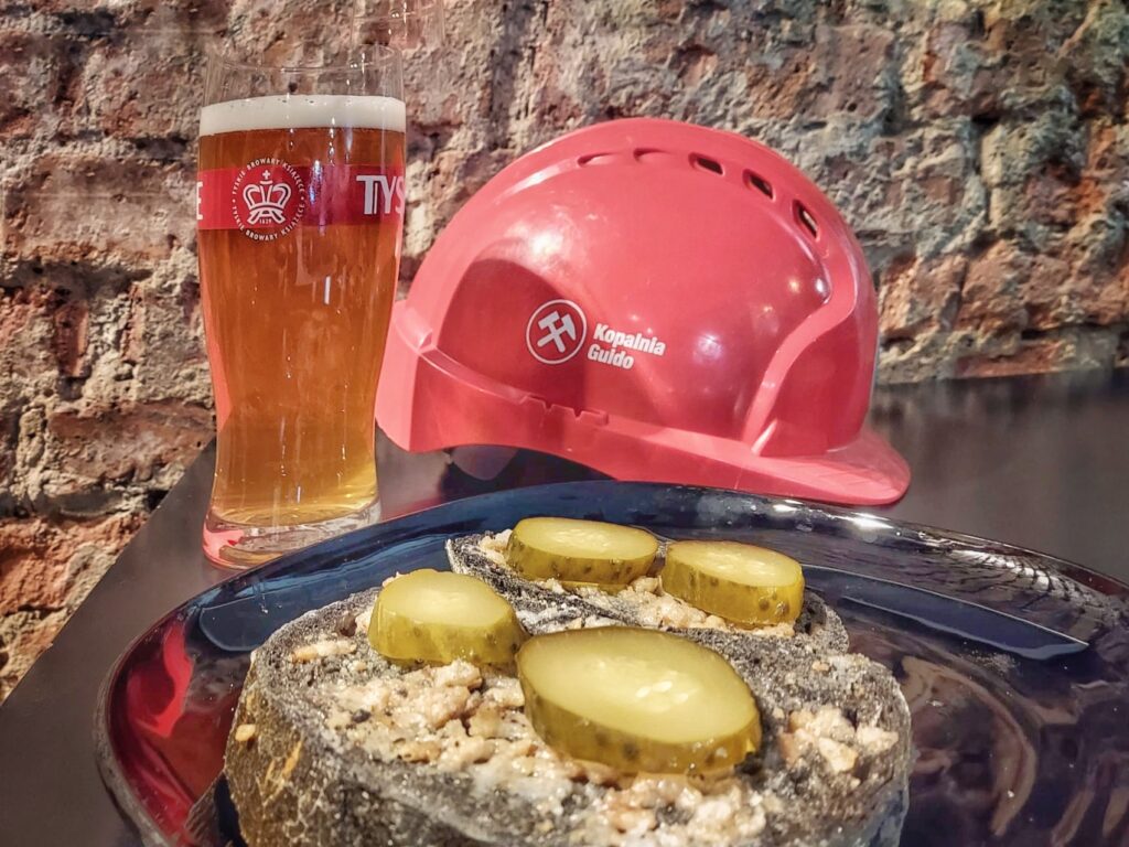 Pub mieści się w zabytkowej kopalni Guido. Można do niego zjechać specjalnie [bilet kosztuje 10pln] lub zajrzeć na końcu zwiedzania. My byliśmy akurat w Guido w celu zwiedzania, więc na koniec weszliśmy do pubu posilić się piwkiem – warzonym specjalnie i dostępnym tylko tutaj, oraz sznytą z tłustym. Menu pubu nie jest specjalnie urozmaicone – specjalne piwka to Giudo [jasne] i Luiza [ciemne], są podstawowe kawy i napoje. Poza wspomnianą sznytą jest żurek i bigos, a do tego ciasto i zapiekanka. Niemniej – myślę, że fajnie czegoś takiego doświadczyć. Nie wiem, czy to tylko nasze wrażenie – ale jak w górach chwyta wolniej, tak chyba w kopalni – szybciej 🙂 Prawie nas to jedno piwo upiło 🙂