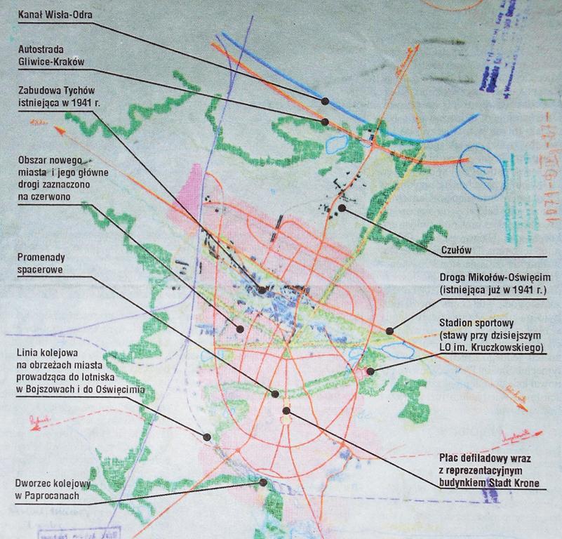 Ale zmiany nazw istniejących budynków i ulic to nie wszystko. Za czasów hitlerowskiej okupacji powstał bowiem pierwszy plan rozbudowy Tychów [bazujący na pochodzącej z czasów zaborów niemieckiej koncepcji deglomeracji Śląska z zespołem miast sypialni wokół terenów bardziej przemysłowych], które miały stać się nową stolicą Górnego Śląska. Znaleziono mapy i plany koncepcyjne z opisami tej rozbudowy, więc prawdopodobne jest, że gdyby Hitler wojny nie przegrał, to pomysł ten zostałby zrealizowany. W planach tych przez Czułów przebiegać miała autostrada, a w Bojszowach znajdować się międzynarodowe lotnisko. W niemieckiej koncepcji rozbudowa Tychów miała być prowadzona po obu stronach trasy Oświęcim-Mikołów z przewagą po stronie południowej. Na osi wschód – zachód planowano leśną zieloną linię, w okolicach I LO znajdować miał się stadion. Plany te nie różnią się wcale przesadnie od tych, które później zostały zrealizowane przez socjalistów. Oś północ południe Niemcy poprowadzili od Starego Miasta, przez Krone Stadt [Koronę Miasta w miejscu obecnej Bramy Słońca], po dworzec kolejowy Paprocany.